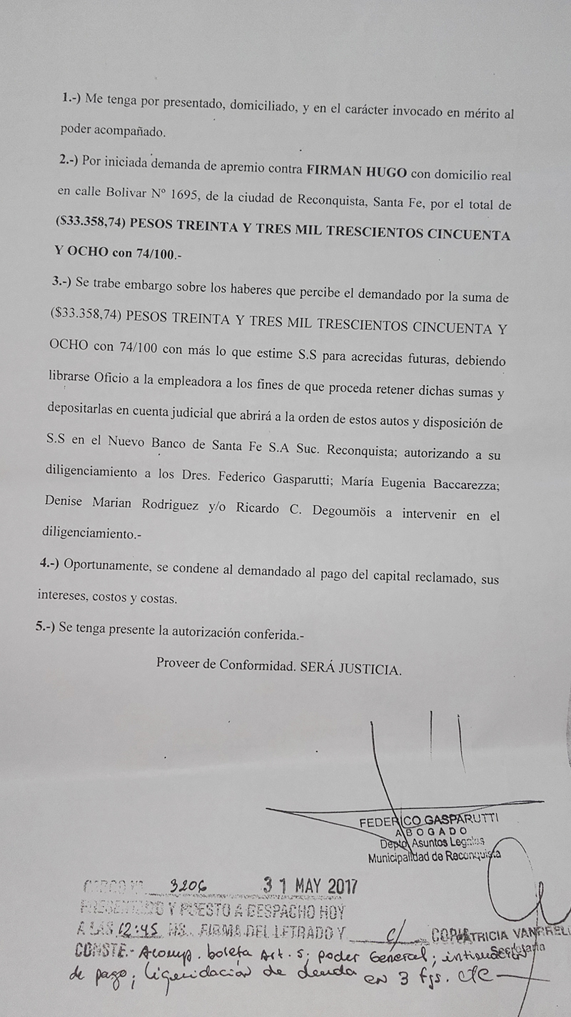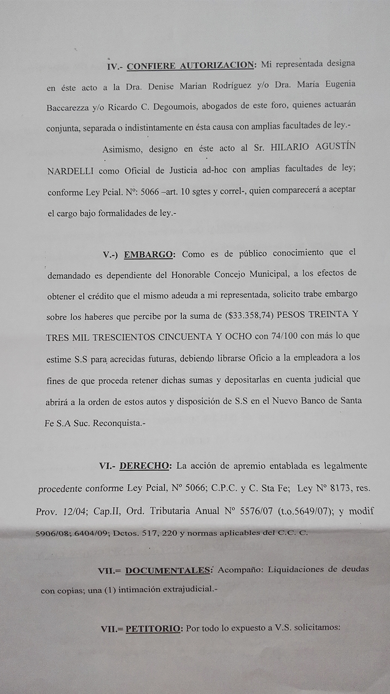 El abogado pide que se le embargue el sueldo al concejal: “como es de público conocimiento que el demandado es dependiente del Honorable Concejo Municipal, a los efectos de obtener el crédito que el mismo adeuda a mi representada, solicito trabe embargo sobre los haberes que percibe por la suma de ($33.385,74) PESOS TREINTA Y TRES MIL TRESCIENTOS CINCUENTA Y OCHO con 74/100 con más lo que estime S.S. para acrecidas futuras, debiendo librarse oficio a la empleadora a los fines de que proceda retener dichas sumas y depositarlas a la cuenta judicial que abrirá a la orden de estos autos y disposición de S.S. en el Nuevo Banco de Santa Fe S.A. Suc. Reconquista”.