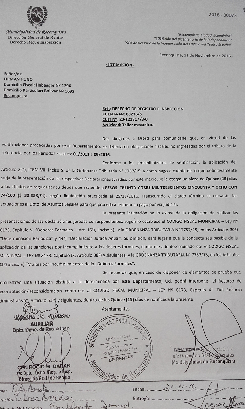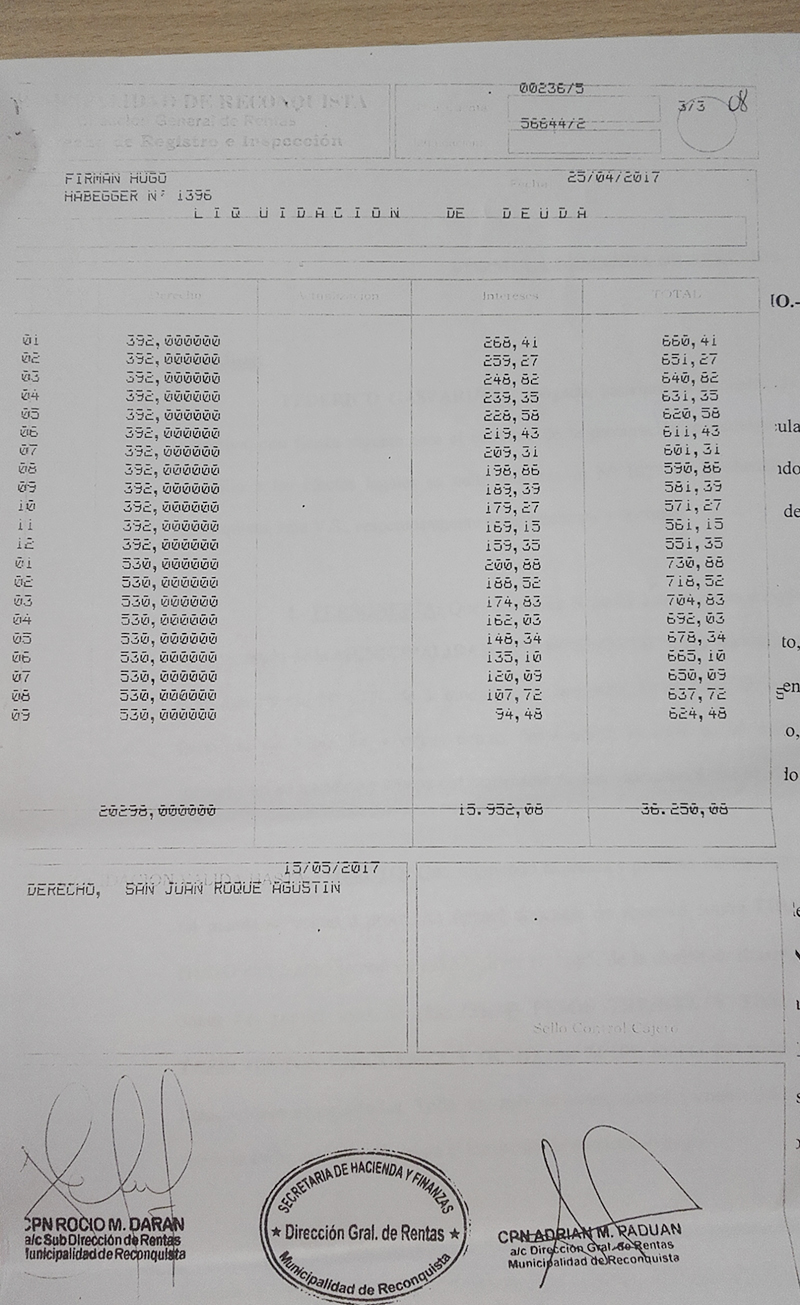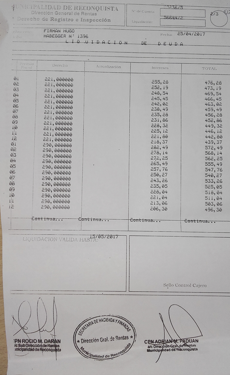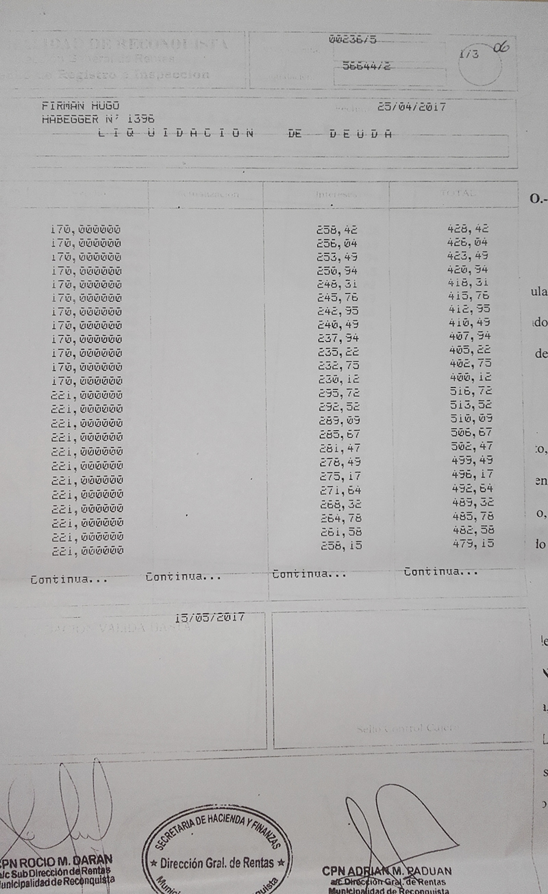 “El demandado adeuda a mi representada (Municipalidad de Reconquista) dicho importe en concepto de “DERECHO DE REGISTRO E INSPECCIÓN- Cta. N° 00236/5” deuda que comprende los períodos 01/2011 a 09/2016, conforme liquidaciones que en original y copias se adjuntan; por derechos mínimos a cuenta hasta la presentación de las declaraciones juradas respectivas”, dice el texto dejando claro que la deuda podría ser considerablemente mayor pero que Hugo Firmán no declaró cuánto facturó en todos esos años.