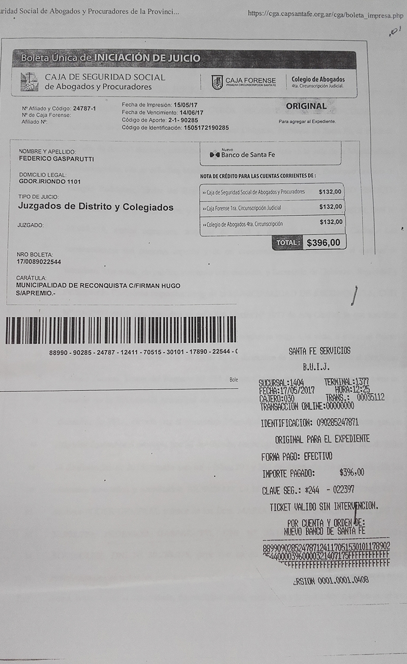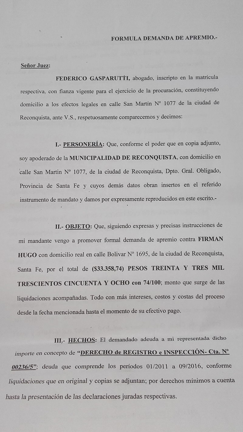 “El demandado adeuda a mi representada (Municipalidad de Reconquista) dicho importe en concepto de “DERECHO DE REGISTRO E INSPECCIÓN- Cta. N° 00236/5” deuda que comprende los períodos 01/2011 a 09/2016, conforme liquidaciones que en original y copias se adjuntan; por derechos mínimos a cuenta hasta la presentación de las declaraciones juradas respectivas”, dice el texto dejando claro que la deuda podría ser considerablemente mayor pero que Hugo Firmán no declaró cuánto facturó en todos esos años.