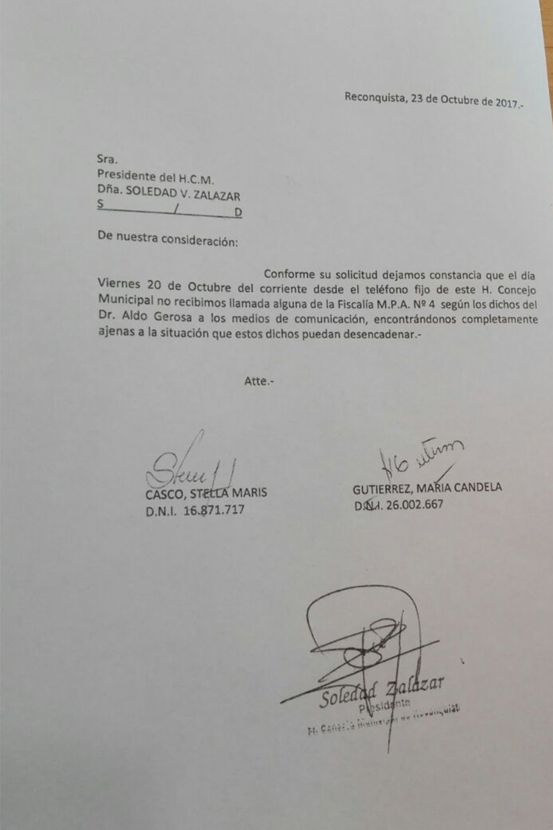 La información fue brindada por Stella Maris Casco y María Candela Gutierrez, ambas personal del Concejo, quienes le aseguraron de manera escrita a Soledad Zalazar “no haber recibido al teléfono fijo del H. Concejo Municipal llamada alguna proveniente de la Fiscalía M.P.A. N°4 el pasado viernes 20 de octubre”.