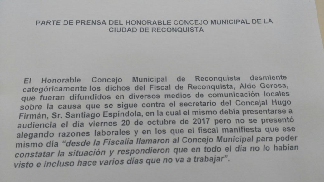En el día de ayer el Concejo Municipal de la ciudad de Reconquista, de manera orgánica y con la firma de su Presidenta, emitió un comunicado en el que niega rotundamente que se hayan comunicado telefónicamente el pasado viernes desde Fiscalía para saber si Santiago Espíndola se encontraba trabajando en el lugar.