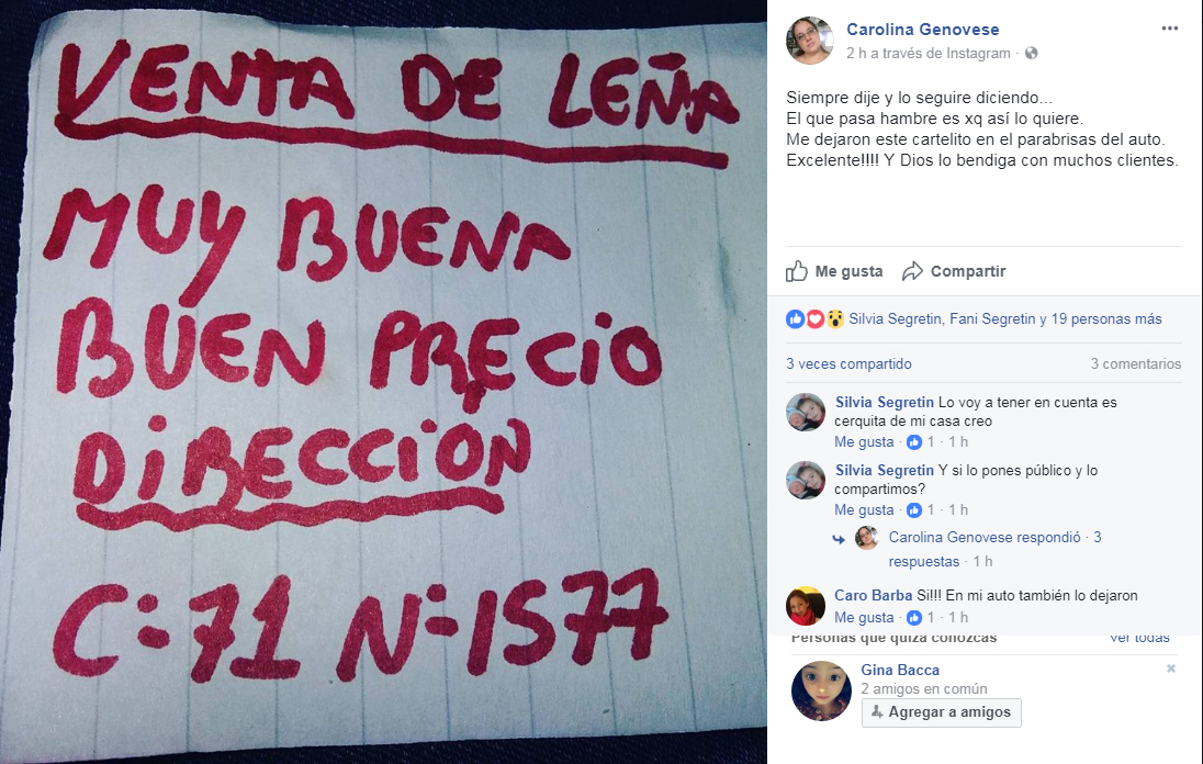«Siempre dije y lo seguiré diciendo… El que pasa hambre es xq así lo quiere. Me dejaron este cartelito en el parabrisas del auto. Excelente!!!! Y Dios lo bendiga con muchos clientes», escribieron en Facebook luego de que en la mañana de este jueves varios vecinos recibieran la publicidad.