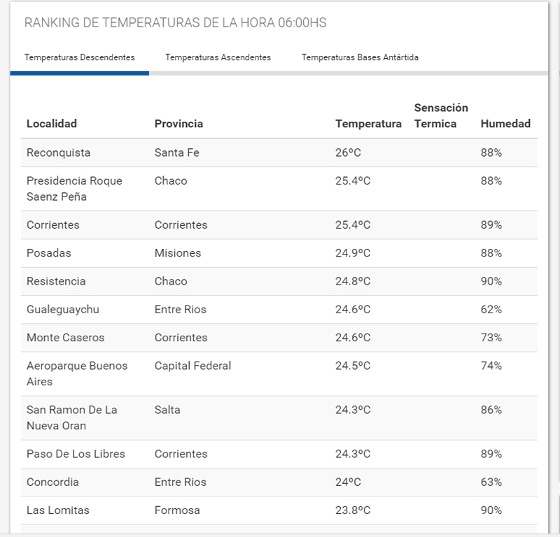 El amanecer de Reconquista vuelve estar en el tope del ranking que realiza el Servicio Meteorológico Nacional sobre las ciudades con temperaturas más altas.
