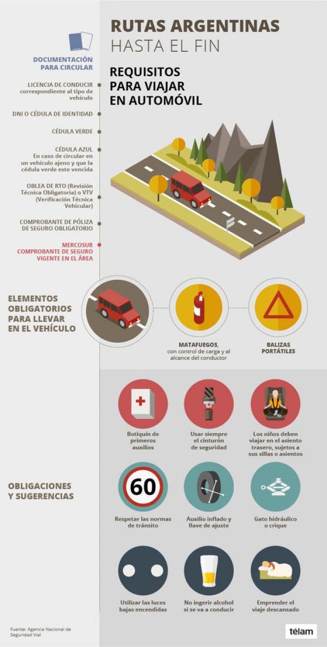 Para salir a la ruta los automovilistas deben tener como documentación obligatoria: la licencia de conducir correspondiente al tipo de vehículo, el DNI, la cédula verde o cédula azul -en caso de circular en un vehículo que no sea de su propiedad-, el comprobante de póliza de seguro vigente, cristales y parabrisas grabados con la patente y la oblea de la VTV (Verificación Técnica Vehícular). A eso debe sumarse, si corresponde, la credencial de GNC y la oblea actualizada.