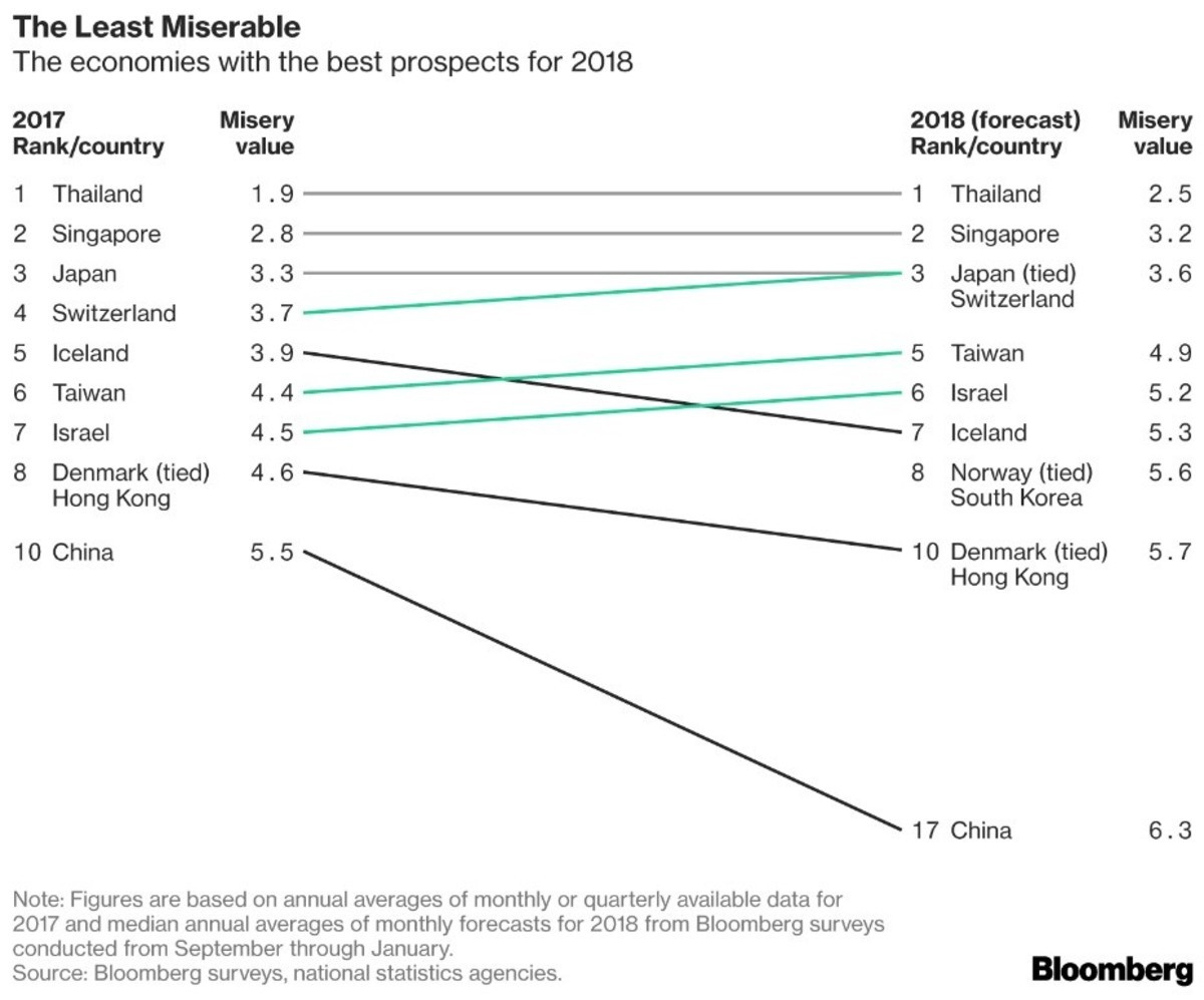 Tailandia volvió a reivindicar la categoría de “menos miserable”, si bien la manera singular del país de calcular el desempleo hace que el número dos, Singapur, sea digno de mención. En otros lugares, México espera dar grandes pasos este año con una inflación más manejable, en tanto Rumania absorbe más miseria por el motivo opuesto.