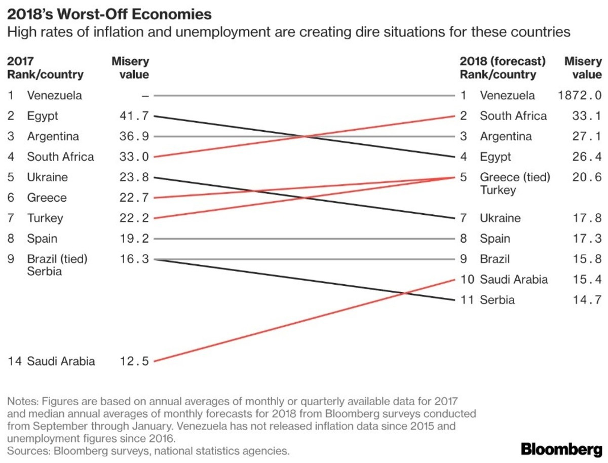 La Argentina mantuvo el tercer puesto en el ranking de economías «más miserables» que realiza la agencia Bloomberg (Misery Index) y que resume las perspectivas en materia de inflación y desempleo para 66 economías. Por arriba están Venezuela, que mantiene el primer puesto, y Sudáfrica, que desde el cuarto lugar.