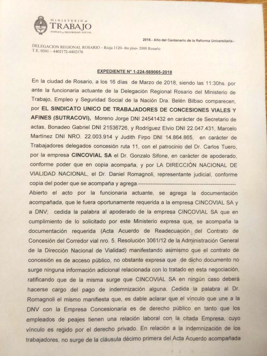 El apoderado de la empresa CINCOVIAL, Dr. Gonzalo Sifone, fue el primero en pedir la palabra y, de acuerdo al acta firmada por las partes, presentó el Acta Acuerdo de Readecuación del Contrato de Concesión del Corredor Vial N° 5. Resolución 3061/12 de la Administración General de la Dirección Nacional de Vialidad, manifestando asimismo que el contrato de concesión es de acceso público, no obstante expresa que de dicho documento no surge ninguna información adicional relacionado con lo tratado en esta negociación, ratificando que de la misma surge que CINCOVIAL SA en ningún caso deberá hacerse cargo del pago de indemnización alguna.