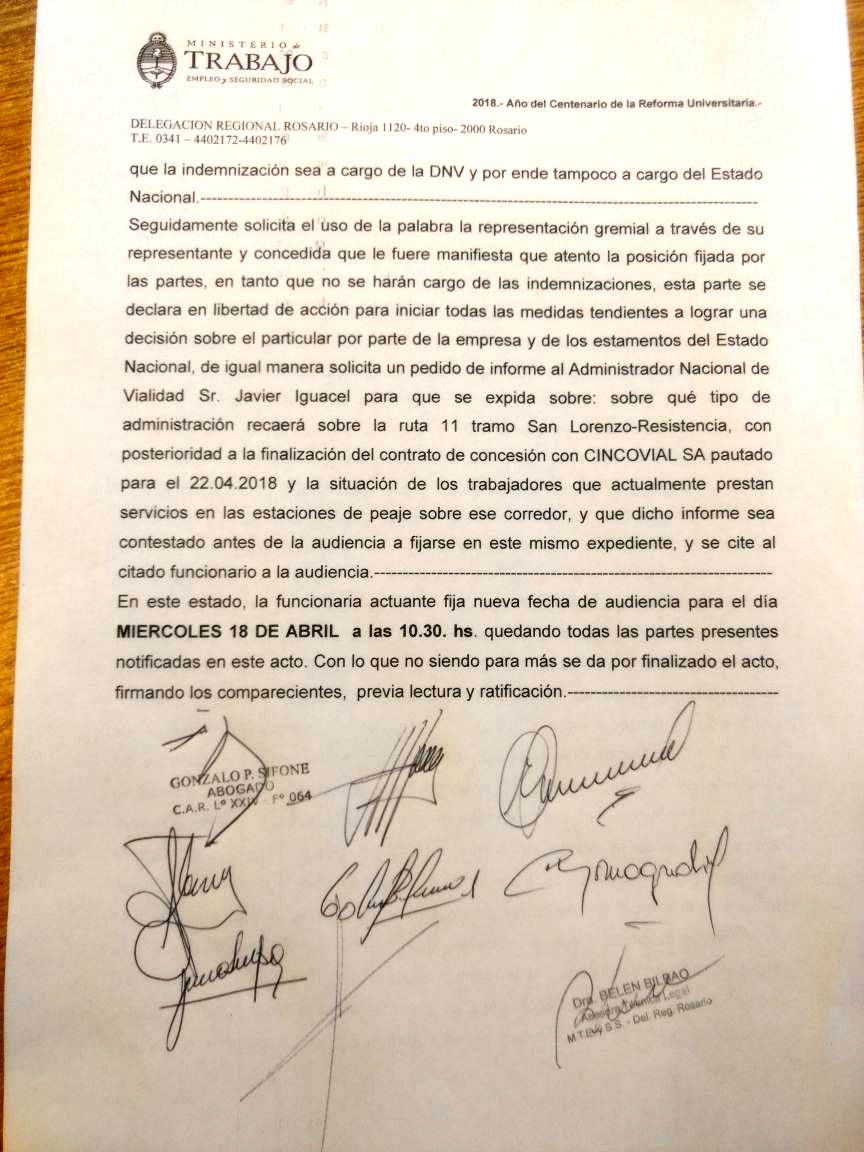 Los trabajadores, representados por su gremio, un representante de la empresa y uno de Vialidad Nacional se reunieron en el Ministerio de Trabajo de la ciudad de Rosario el último viernes. Allí se dejó en claro que nadie quiere hacerse cargo de la indemnización de los trabajadores que quedarán en la calle por la decisión del Gobierno Nacional de levantar los peajes de la Ruta Nacional N° 11.