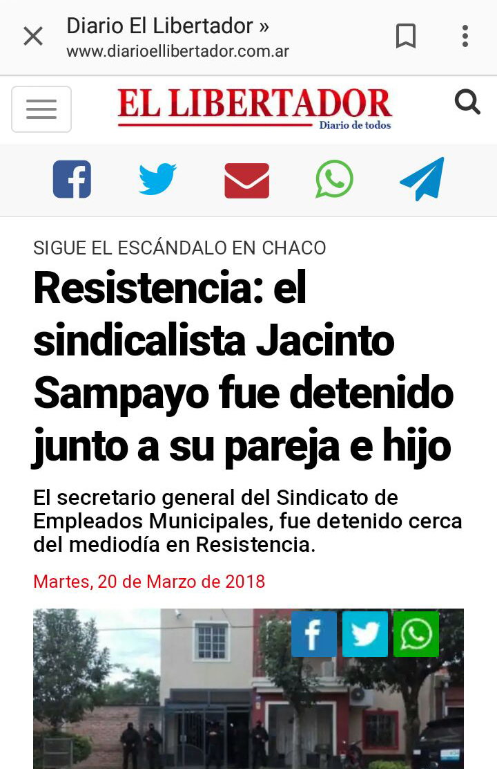 Allí Arroyo comenzó a contar que «lo que está pasando en Chaco es que hoy hubo 16 allanamientos y hay treinta y cuatro detenciones en una causa que investiga la Justicia Federal. Una investigación preliminar que arranca con el Fiscal Sabadini y hay detenido un sindicalista, estamos hablando del Secretario General del Sindicato de Trabajadores Municipales de Resistencia. Es el sindicalista Jacinto Sampallo que está detenido él, su hijo y su esposa (…)».
