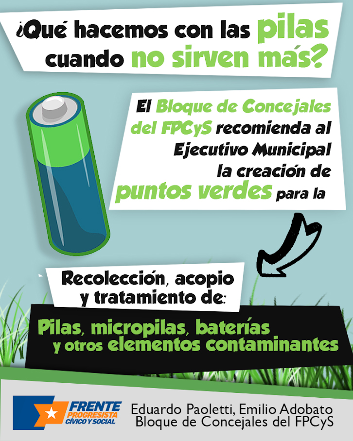 El Bloque de Concejales del FPCyS, integrado por Emilio Adobato y Eduardo Paoletti, recomienda la instalación de “puntos verdes” en la ciudad para la recolección, acopio y posterior tratamiento de pilas, micropilas, baterías y otros elementos contaminantes.