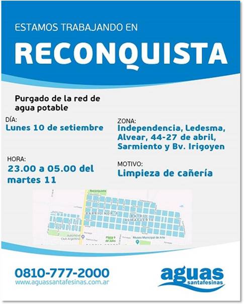 Aguas Santafesinas S.A informa a los usuarios de la ciudad de Reconquista que realizará un operativo intensivo de mantenimiento de la calidad del servicio con trabajos programados por sectores para optimizar el funcionamiento de la red de distribución domiciliaria.