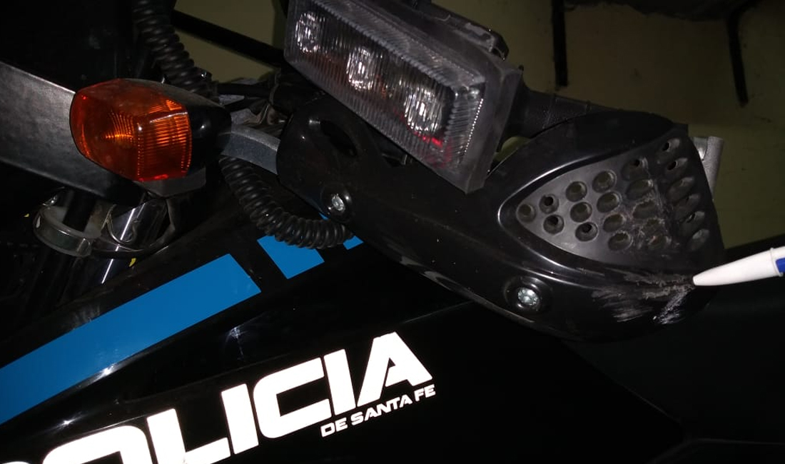 Sigue por Bv. Irigoyen con el patrullero detrás e ingresa por Alvear. En la esquina de Amenabar detiene su marcha y cuando los policías se bajan para identificarlo vuelve a acelerar pero esta vez choca contra el policía y su moto cae al piso rompiendo algunas partes plásticas.