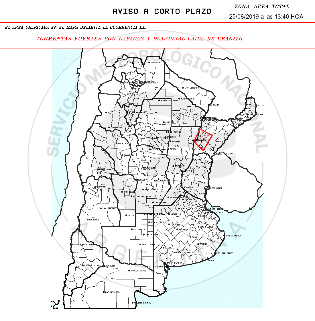 El alerta fue lanzado a las 13.40 Hs y con una validez de hasta tres horas.