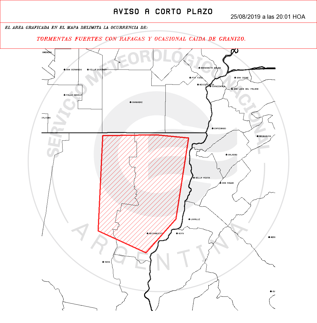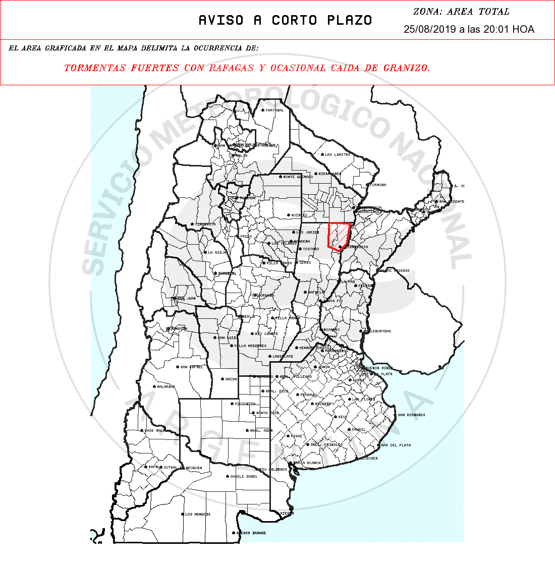 El «alerta de corto plazo» fue lanzado a las 20 Hs de este domingo y con una validez de tres horas.