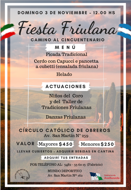 El Gobierno de Avellaneda y el Centro de Friulanos de esta ciudad invitan a la comunidad a participar de una nueva edición de la Fiesta Friulana que tendrá lugar el domingo 3 de noviembre a las 12hs en el Círculo Católico de Obreros (Av. San Martín 259).