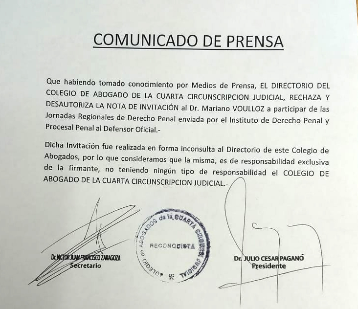 «El Colegio de Abogados comentó que «habiendo tomado conocimiento por Medios de Prensa, EL DIRECTORIO DEL COLEGIO DE ABOGADOS DE LA CUARTA CIRCUNSCRIPCIÓN JUDICIAL, RECHAZA Y DESAUTORIZA LA NOTA DE INVITACIÓN al Dr. Mariano VOULLOZ a participar de las Jornadas Regionales de Derecho Penal enviada por el Instituto de Derecho Penal y Procesal Penal al Defensor Oficial».