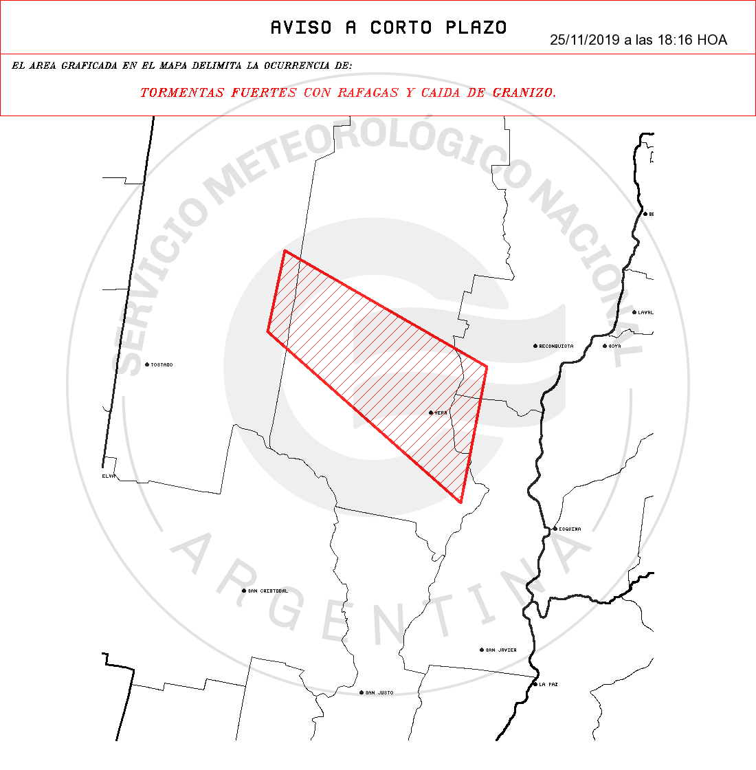 El área de cobertura continuará siendo afecta por lluvias y tormentas, se espera que alguna de estas puedan ser localmente fuertes y estar acompañadas de fuerte actividad eléctrica, abundante caída de agua en cortos períodos, ráfagas y caída de granizo. No se descartan mejoramientos temporarios se estiman valores de precipitación acumulada de entre 15 y 50 mm, pudiendo ser superados en forma localizada. Se determina el cese de alerta para el centro y sudeste de Córdoba, sur de Entre Ríos y sur de Santa Fe.