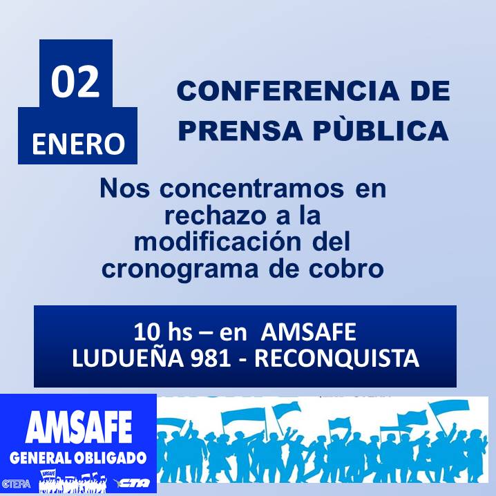Mediante un comunicado AMSAFE expresó que «desde el sindicato vamos a reclamar a las autoridades por la urgente revisión de cronograma de cobro, que excede ampliamente lo señalado por la Ley en cuanto al pago de haberes dentro de los primeros 5 días hábiles de cada mes».