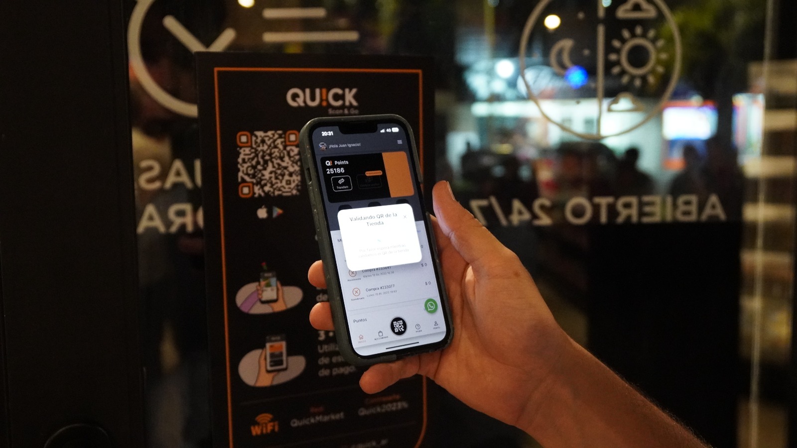 El cliente debe descargar la app de Quick Scan&Go y escanear el código QR de la puerta para ingresar. Luego elige los productos, escanea su código, acepta la compra y paga con tarjeta de crédito, débito o Mercado Pago.