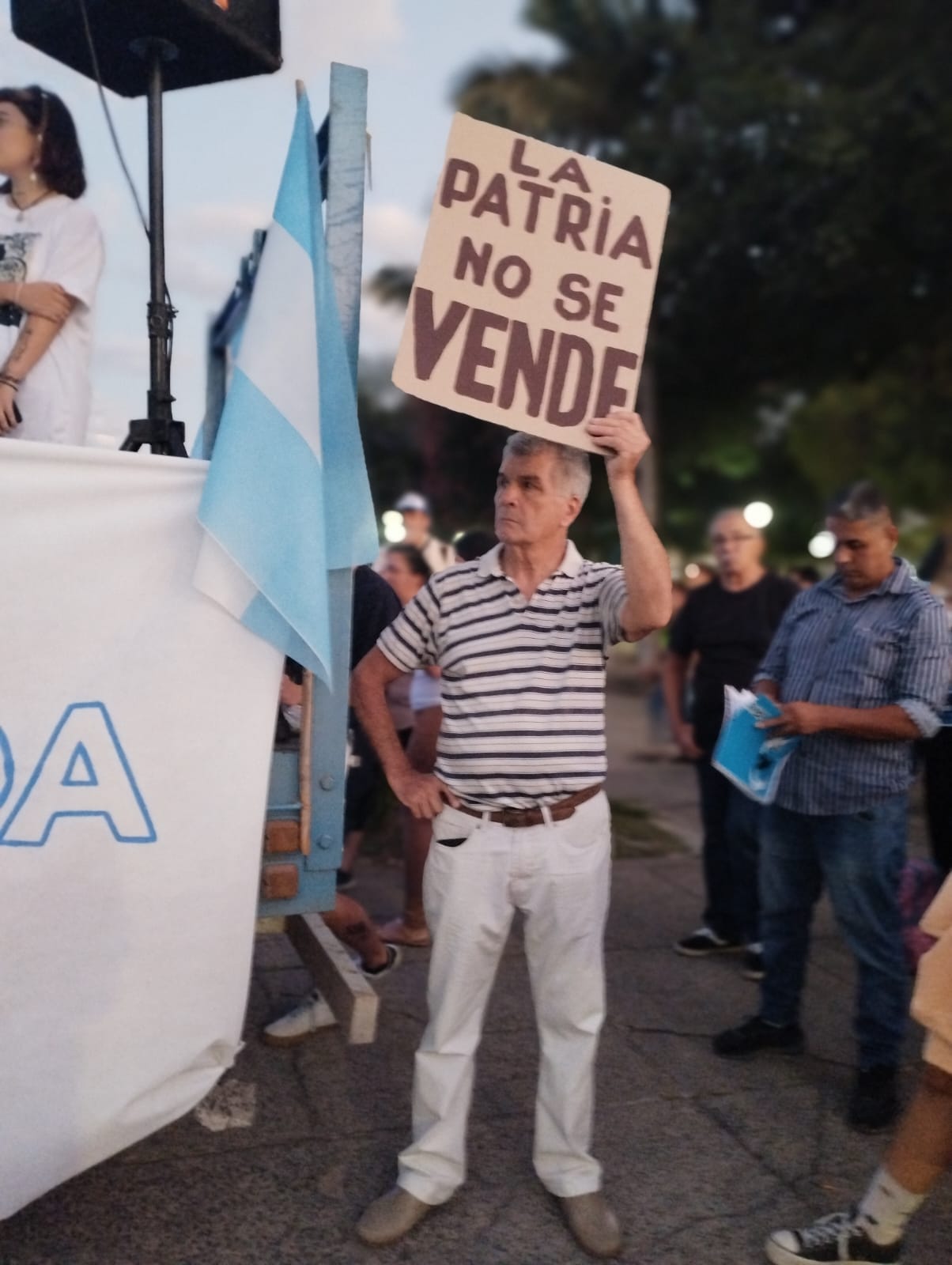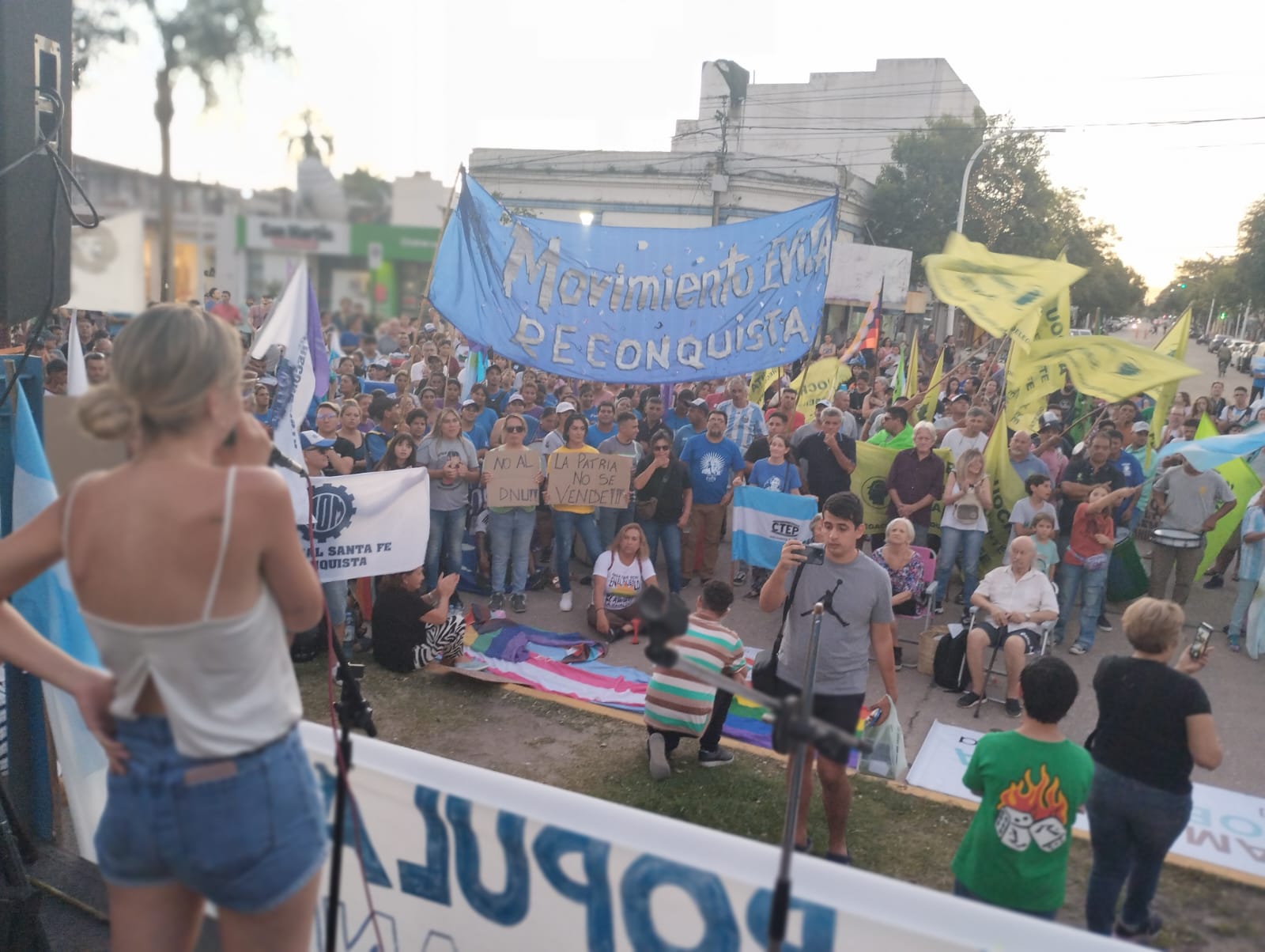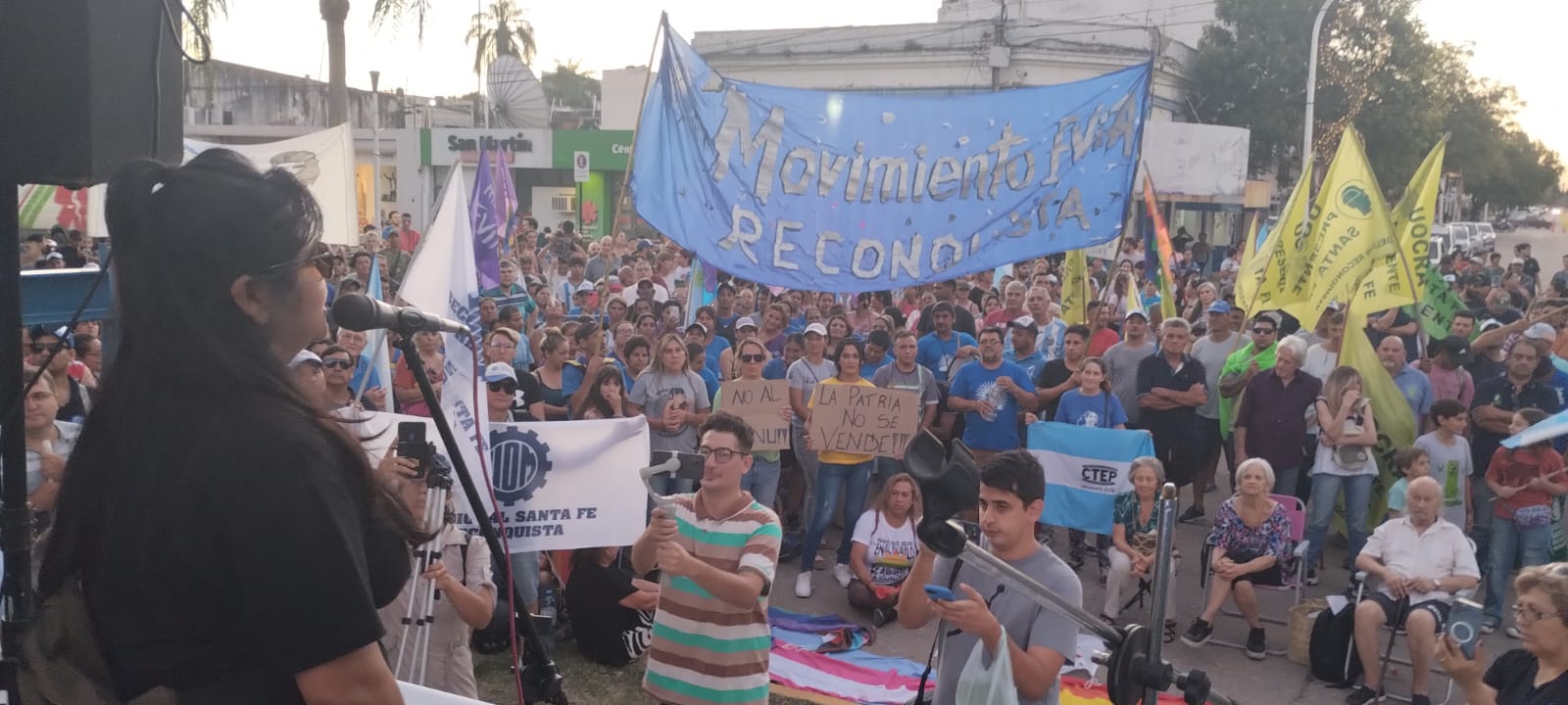 Esta tarde, cerca de las 19 horas, personas de Reconquista se concentraron en la Plaza 25 de Mayo -esquina Patricio Diez e Irigoyen- para marchar en contra del gobierno de Javier Milei, ante las propuestas del mega dnu y la ley ómnibus, entre otros motivos. La consigna fue «La Patria no se vende».