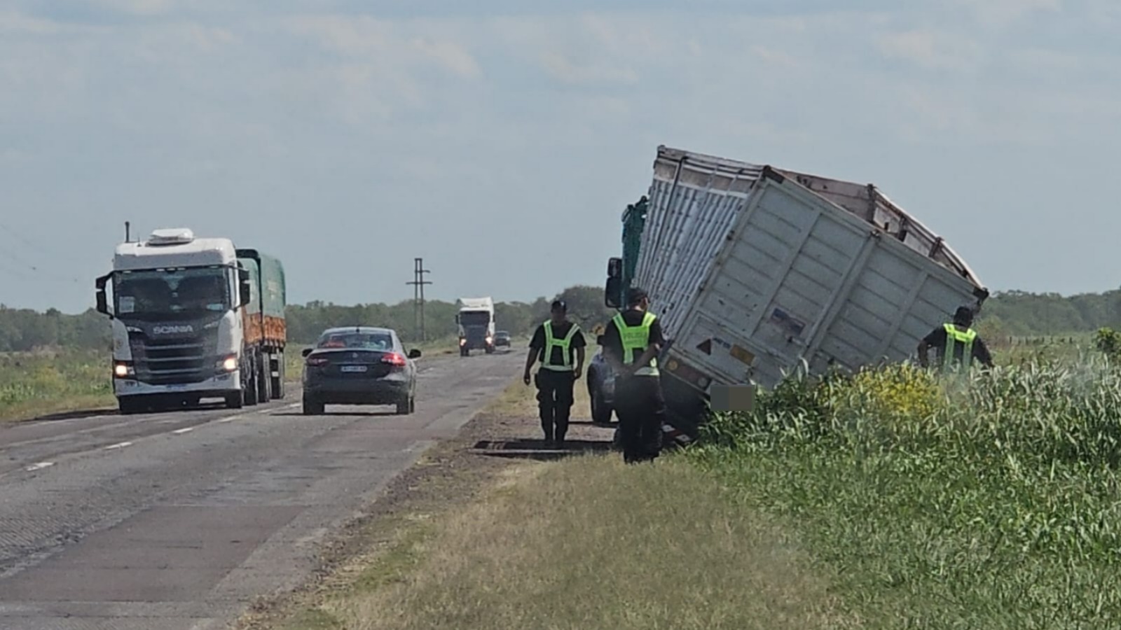 Este viernes, alrededor de las 13.45 horas, sobre la Ruta Nacional N° 11, a la altura del kilómetro 740, un camión se despistó y terminó con una de sus ruedas dentro de una alcantarilla.